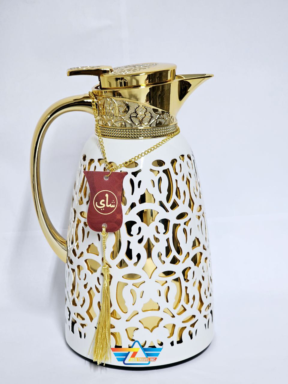 The coffee Thermos is taller and thinner than the gold coffee pot. It has a long, curved spout and a handle that extends from the base to the top of the pot. The gold coffee pot is shorter and wider than the silver coffee pot. It has a shorter, straighter spout and a handle that extends from the base to the middle of the pot.